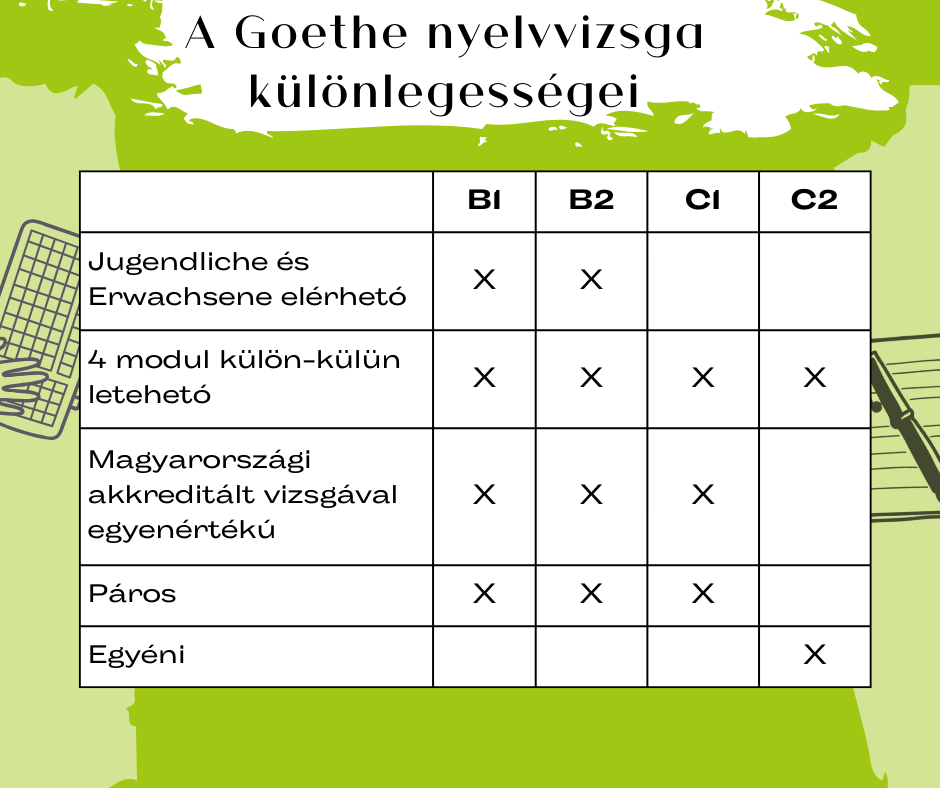 Egy összefoglaló táblázatot a Goethe-Zertifikat különlegességeiről és a 2024-es vizsganaptárat itt találod: